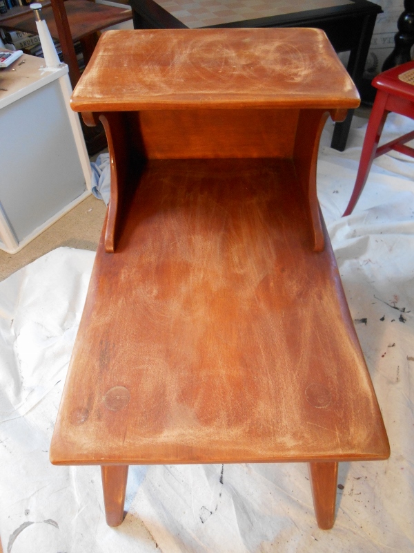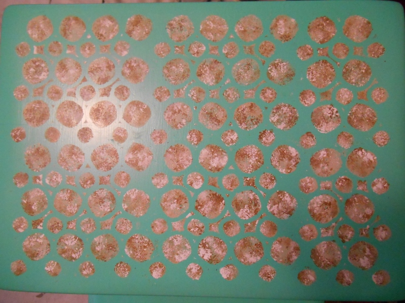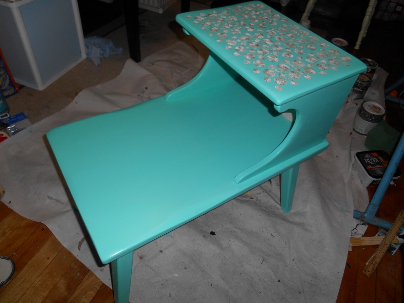 It’s a good, solid, mid-century end table that just needed some pizazz. When I decided that this was the piece to flip and donate I knew I wanted it to relate to Salem somehow. No, not witches!! I was thinking more along the lines of the beach. My first idea I had I realized I just didn’t have the time to do. I’ll save that idea for another piece! My second idea was to do some sort of pattern on the top level that would be sorta cool and mod looking. The stencil I used didn’t quite work out the way I wanted, so I just made it work. The pattern that emerged made it look like sand and pebbles! Perfect for Salem! See? It’s sorta cute….I thought at the time. Sorta.