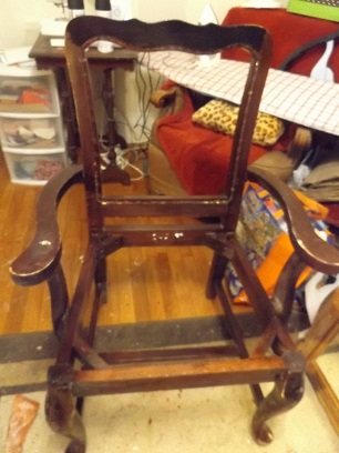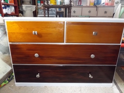 Speaking of brown furniture. I have a friend Ron, who I met when he taught me how to re-cane chairs. He HATES painted furniture!! I get it. I have a degree in the history of decorative arts, and although furniture was not my interest or focus of study (ironic, I know) I DO have a great respect for the natural beauty of a piece of wood. I love the beauty of the grain and the finish of unpainted furniture. I know that in the antiques and auction world a piece of furniture in it’s natural state is always much more valuable than a piece that’s been altered in ANY way. But I’m not working on museum pieces. I wouldn’t consider painting a piece that I have if the wood is good and is still beautiful. If I can clean it up, maybe restain I’m happy to do so. But the fact is the pieces I work on are the ugly, beat-up, discarded, mess of a remnant of a once nice piece. So I can leave it on the side of the road or in a thrift shop, ugly and unloved, and probably headed to the dump, or I revive it and make it wanted and desired again. The fact is, these days most people don’t go for what we call “Brown Furniture.” So I paint. Or decoupage. Or both.